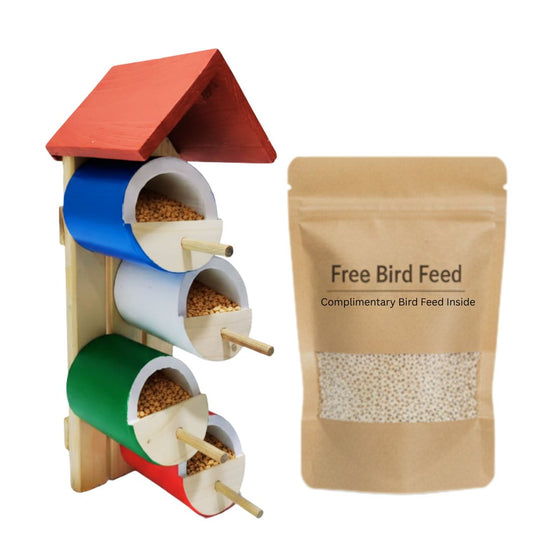 Pocket Feeder with Free Bird Feed | Designed to feed small birds – Bulbul, Sparrows, Flinches |Keeps away large pigeons, crows, eagles | Balcony, Garden & Home | Made from Bamboo, Wood | Dry feed only